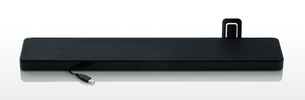 It’s a hollow plastic 60 cm long bar slightly angled towards you and fitted with a full length rubber mat. Underneath there are a series of rings and hooks to ribbon cables leading to a 4-port USB hub. The execution is simple and pretty flawless. By neatly tucking cables underneath the bar and only leaving enough length to plug into whatever it is that needs charging/syncing – you literally clear your desktop. At its most extreme – the SpaceStation is perfect for minimalist interiors. The elevation is just enough to gently “offer” your keyboard at a very ergonomic angle. There’s even a rear accessory rail, sort of a notch running behind the rubber mat for business cards and the included document clip is perfect for office workers.