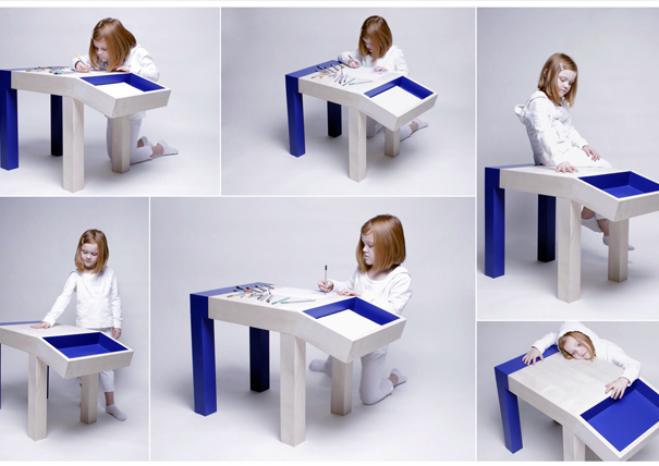 That’s right, this table was, unbeknownst to them, designed by a bunch of five-year-olds. Designer Quentin de Coster had a team of five year olds and thought “what better way to design something that young children can relate to than to have the children design it themselves?” And thus he spake to the kids: “draw me some tables and some doggahs.” And they did, and it was good.