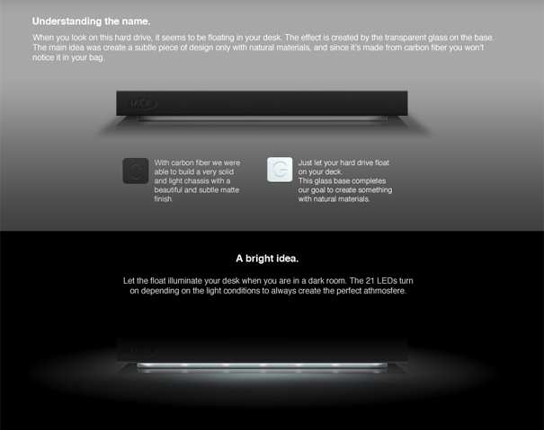 There’s an HDD version and an SSD version, the top is made with carbon fiber and the base is made of glass. The top is sensitive to touch, and the whole project is green as it can be. This is one of those projects where you really wish there were just a few more details that’d made it turn into a real live product. Inspiring!