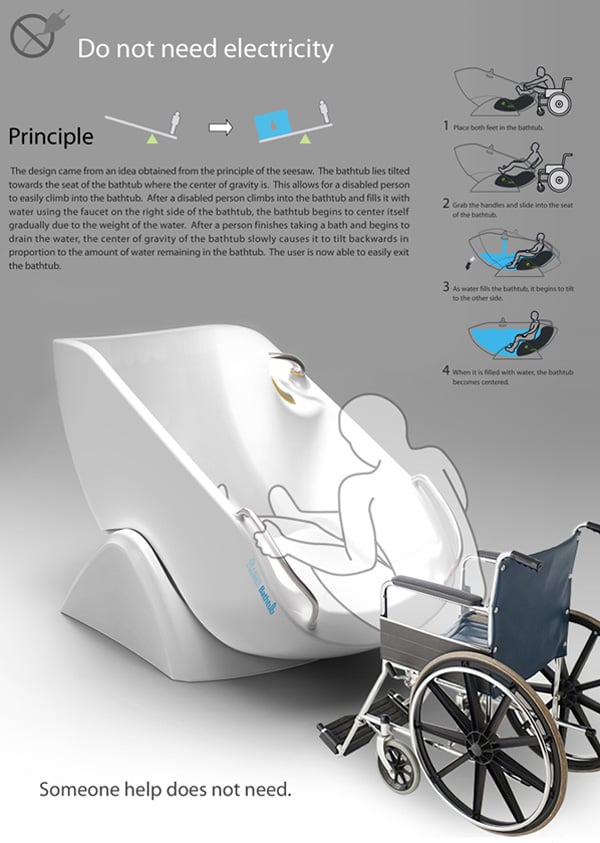 One of the reasons why my mother can never use the tub for a bath is that her acute arthritis and four lower limb joint replacements restrict her movement. With the Flume Tub I’m sure she will be able to just walk into the bath and use it confidently. The tub works on the principles of a seesaw and is built keeping the safety of people with restricted movements in mind. Awesome!