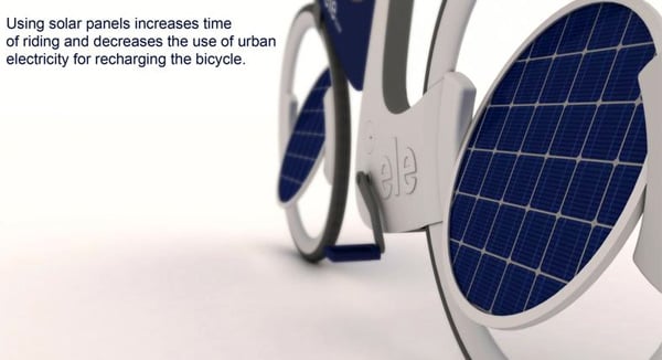 Ele is a solar bicycle with solar panels on its wheels that rotate 30 degrees on both sides, to face toward sun. This is to absorb as much sun-power that it can. This hybrid bike can be charged via electricity and the sun. It works in 3 modes though, muscle power, Semi- electric: electricity helps the user to ride easier and faster. Lastly, The Electric: here it functions completely like an electrical bicycle.