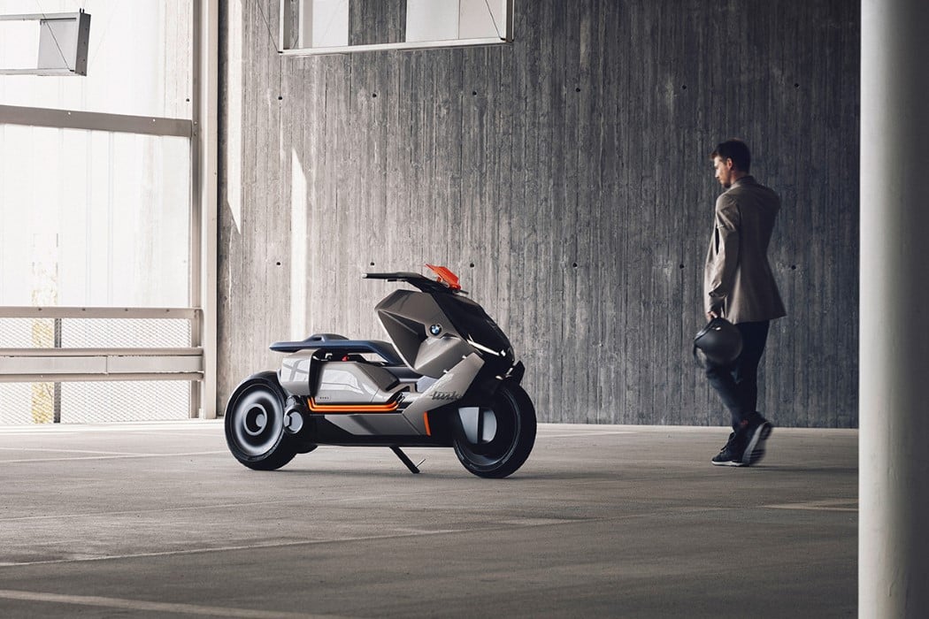 The design of the Concept Link is by far the most interesting. The e-scooter is broad, dominating, low-slung, and you immediately notice the majority of horizontal straight lines making it feel like the scooter is zipping forward. Looking like it was picked right out of a transportation designer’s sketchbook, the scooter’s aesthetic and silhouette are immediately striking and novel. Showcasing BMW’s absolute love for the black/gray color combination, the Concept Link features electric orange highlights that stand out beautifully, almost like war-paint, giving the bike a sense of dynamism.