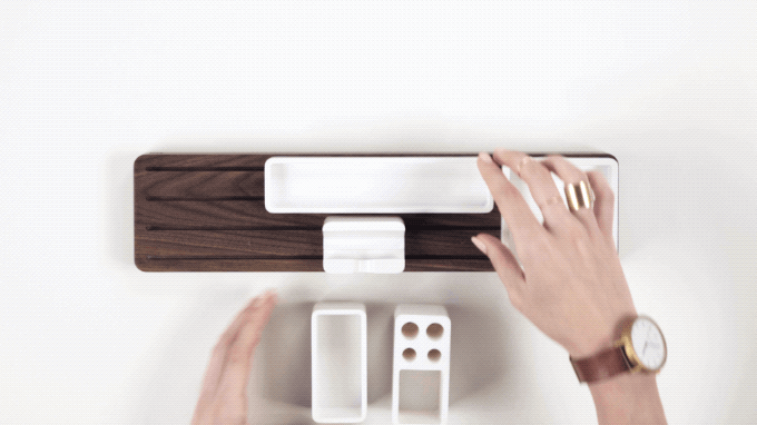 Gather cuts the clutter with sheer minimalism in a way that brings zen to your workplace. Everything has a dedicated spot and a purpose, and Gather allows you to arrange your desk according to your needs as well as your space-availability. The hub of the Gather is a wooden plate with running grooves. This acts as a grid-based dock for the different holders. Add or subtract holders based on your needs or slide them around so that your necessaries stay immediately accessible. The wooden slab comes with two additional accessories that snap to it. A coaster, for your beverages/bottles, and a headphone holder. The orientation varieties are endless and you choose where you want to place each and every individual module. The coaster and headphone holder snap to the sides of the central wooden dock using magnets, and the individual holders fit into the dock’s grooves and can slide around, giving you complete freedom to build your own storage space based on your own needs or idiosyncrasies.