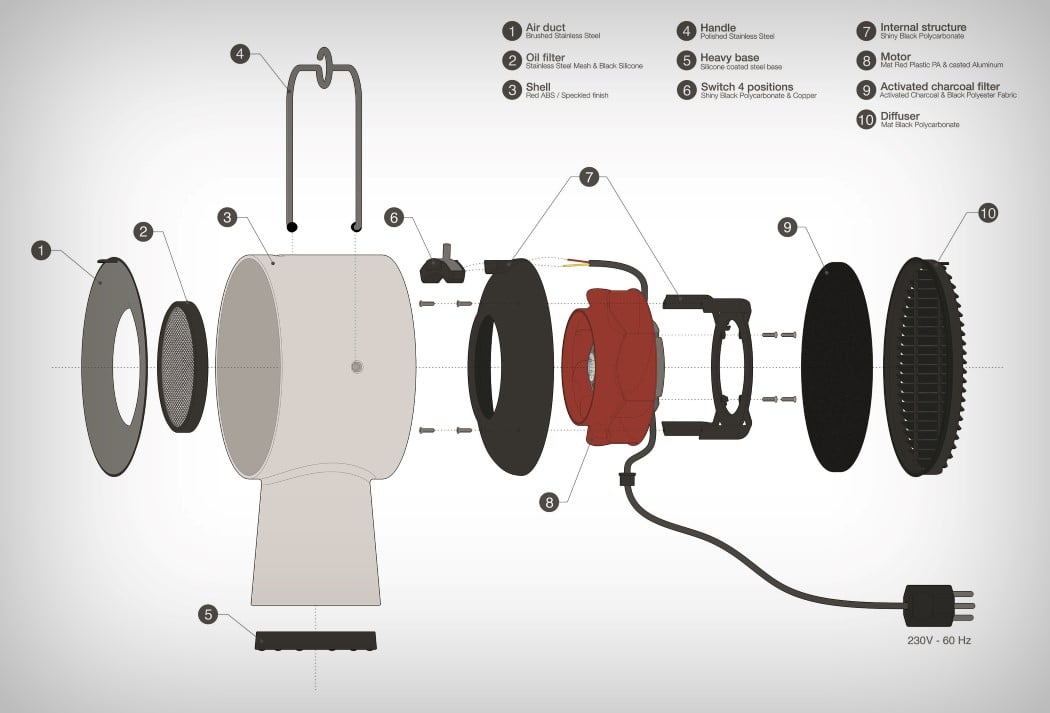 It’s no surprise the Portable Kitchen Hood made its way to the James Dyson Awards. It’s innovative, enriches lives, and looks so much like my favorite Dyson product! The Portable Kitchen Hood by Maxime Augay tackles a problem everyone with small homes has. Smelly, stuffy, dirty kitchens. Where most homes don’t have kitchen chimneys or hoods or even proper ventilation, odors tend to linger on (sometimes fumes too), making the kitchen’s air feel stuffy and unclean.