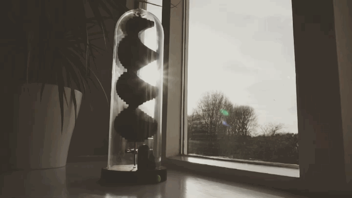 Titled the Uplift, the spiraling wooden structure was made to calm and uplift one’s spirits. Made to move either clockwise or anti-clockwise, the spiral can either rotate upwards or downwards. Designer Tom Lawton says “There isn’t really a wrong or a right way. Steam rises, whirlwinds and smoke flow upwards — molten lava, waterfalls and whirlpools flow down”. Powered by magnets at the base (and with a ‘magnetic wand’ that helps initiate the rotation), the Uplift spins quietly, and for long lengths of time, thanks to its ‘solar engine’- a cleverly designed contact-less rotary drive system that has little to no inertia. The entire sculpture is encased in a glass dome, giving it a personality that feels almost precious and untouched, while making sure external elements like the wind don’t break the Uplift’s hypnotic spinning action!