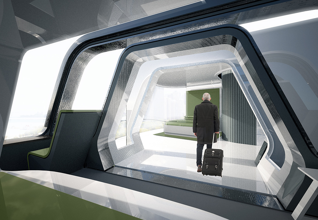 More like a hotel room on wheels than an RV, the ATS is entirely autonomous and works as part of a larger Autonomous Hotel Chain. To access the chain and a personal unit, one must simple input their destinations into the online system. An ATS will be deployed when you need it to ensure you get where you’re going on time and in absolute comfort. Once on board, users will find areas to sleep, lounge, wash, work, eat, and store their belongings… all while taking in the sights from panoramic windows.