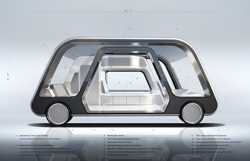 The Autonomous Travel Suite communicates through a central platform called Autonomous Interface, which controls various operations and services in between Travel Suites and Hotel Facilities using advanced technology. Travelers can easily enter multiple destinations and necessary services through an online app. and the Autonomous Travel Suite will be automatically delivered to the travelers front door. The Autonomous Interface will then analyze the best routes and communicate with nearby facilities to arrange requested services along the way. It will automatically control indoor environments and check with your vehicle’s status to make sure everything is in best condition along the trip.
