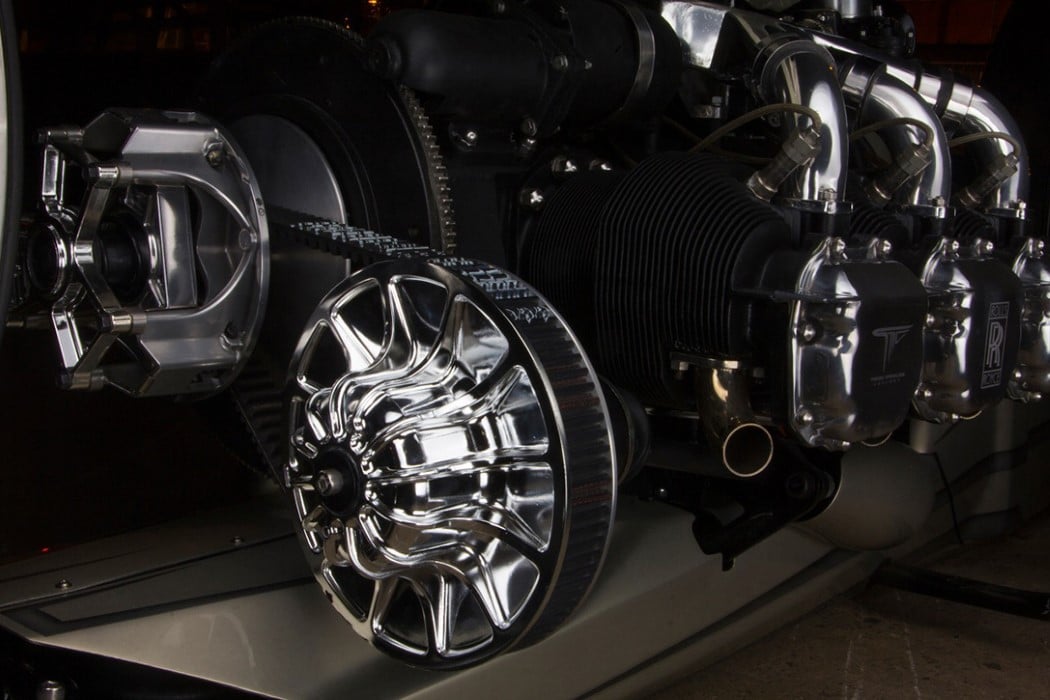 “Over the top” is a phrase that comes to mind when one looks at the TMC Dumont for the very first time. There’s nothing conventional about the bike. It features two massive 36-inch wide hubless wheels on either end of its edgy, characteristic body that features… wait for it… a helicopter engine. Sitting rather visible on the Dumont’s body is a 300-horsepower Rolls-Royce helicopter engine that literally puts the ‘chopper’ in this chopper!