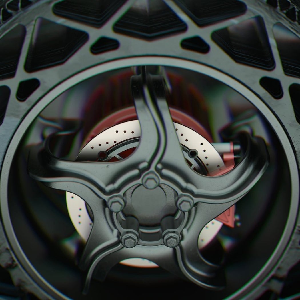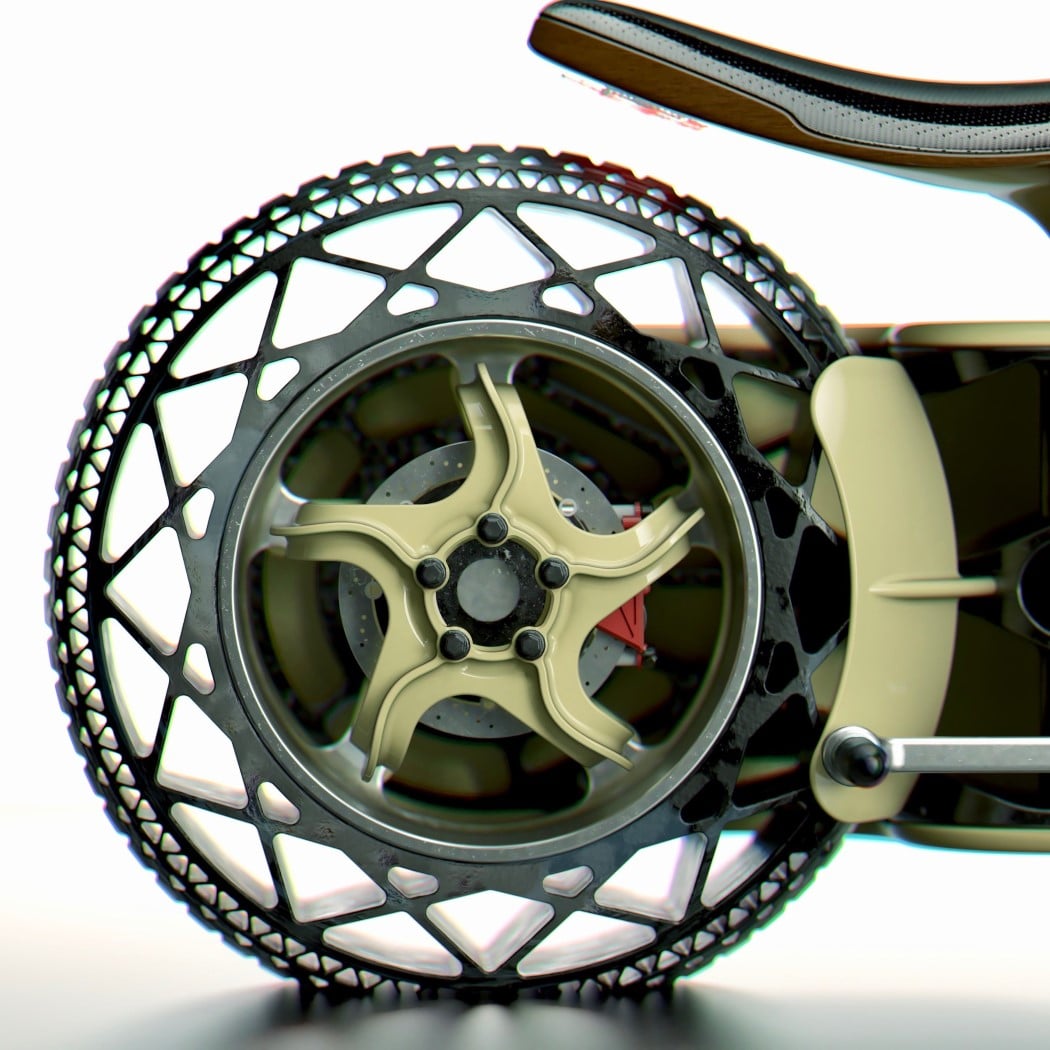 The B3, much like the B1 and B2 in Sedov’s ongoing series, follows the capsule-body silhouette. However, unlike the B1 and B2, the body is relatively smaller than the tires, and doesn’t leave any negative space in the center. The B3 also highlights Sedov’s obsession with triangles, not only using them to create a taillight pattern, but to also create the tires’ airless design. The different sized triangles would help keep the tire sturdy, but give it its bounce. The tires are connected to the bike using a novel single-sided fork design that alternates between the front and rear tires. Like all of Sedov’s B-series motorbikes, the B3 doesn’t have a dashboard either, and boasts of a gently curved leather seat, followed by relatively simple handlebars. There’s also a chance that the seat has a suspension at its base, hidden away in the motorbike’s slim, alluring body. I vote for a proof-of-concept!