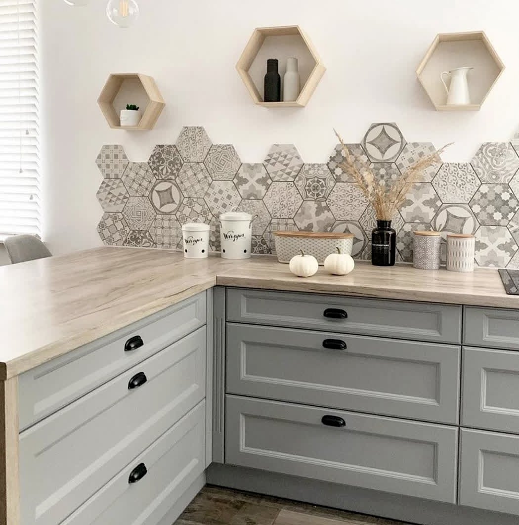 The geometric backsplash in this kitchen is accentuated by pastel drawers, forming a pretty kitchen space ideal for all spring lovers! Designed by Dom W Sansewieriach, the space also features cute little hexagonal wall storage units!