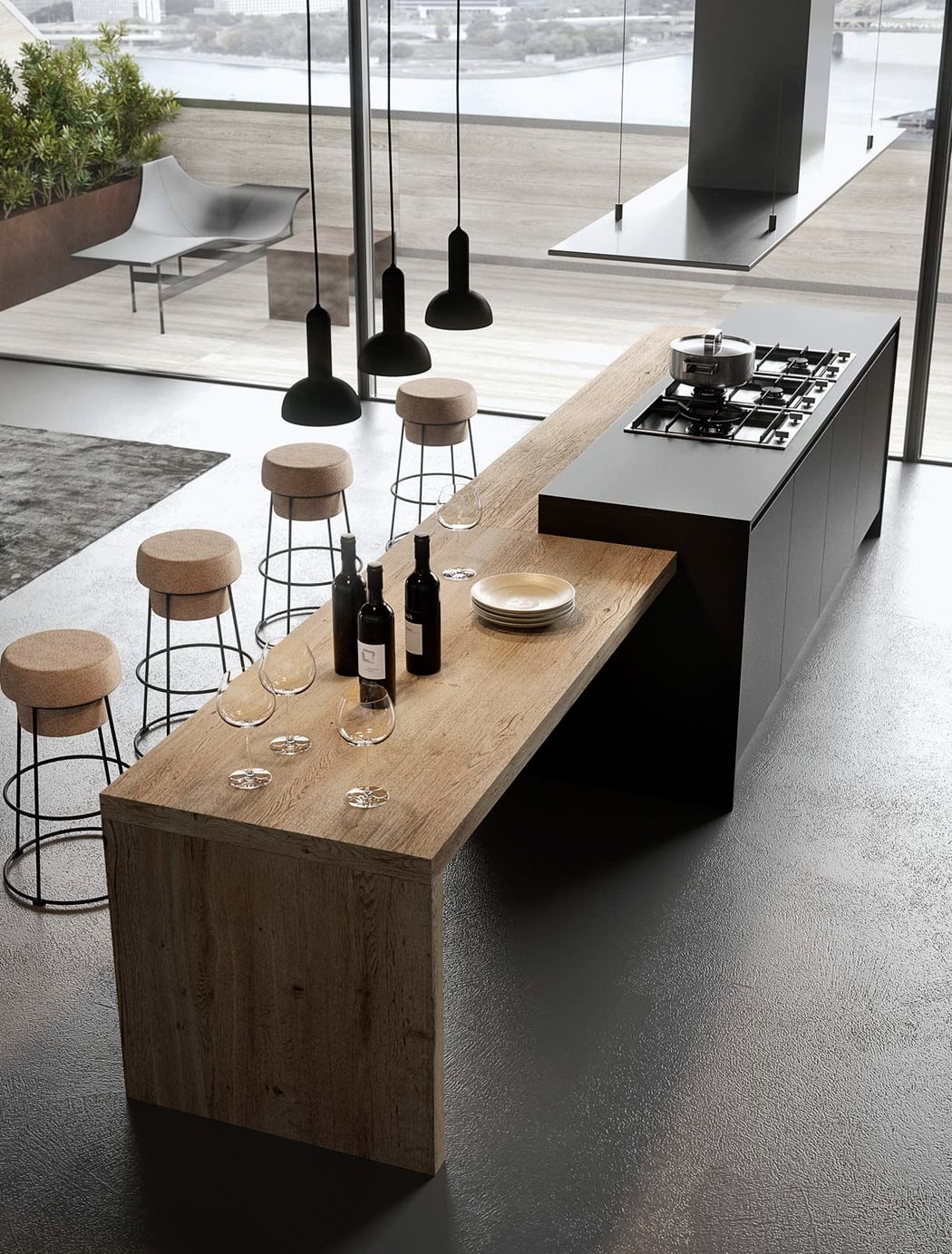 I wouldn’t mind whipping up some breakfast in this beach-facing kitchen by Gicinque Cucine! Minimal wooden stools and a wooden kitchen counter are accompanied by breathtaking views of the ocean.