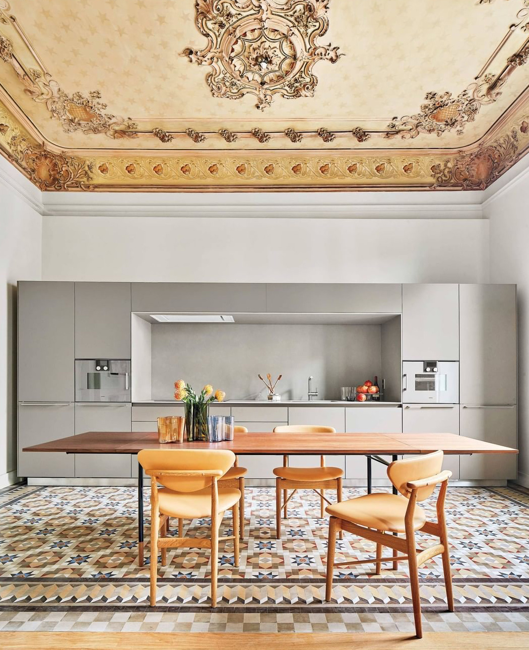 Estudio Vilablanch designed this fun-loving and cheerful kitchen! Colorful orange furniture, patterned floor tiles, and a simple grey kitchen unit make it the perfect spot to cook, wine and dine.