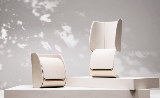 Stork is the result of the harmonization of two forms – the pouf is a comfortable plush seat that provides the user with 4 directions of sitting which encourages collaboration and community-building through the ease of interaction. The beak is a smooth, robust form that functions as a small desk that can conform to the user’s ever-changing seating position. “I began with two volumetric cardboard mockups. One is a modular seat that featured a side slit that could afford adaptors like backrests, personal tables, and pockets. The other mockup was an early version of Stork with a small personal table and a cylinder seat,” explains the designer. She made 3 more cardboard full-scale mockups pushing the ergonomics and human factors of the Stork seat before landing on the final design that would use ribbed plywood and woolen upholstery.