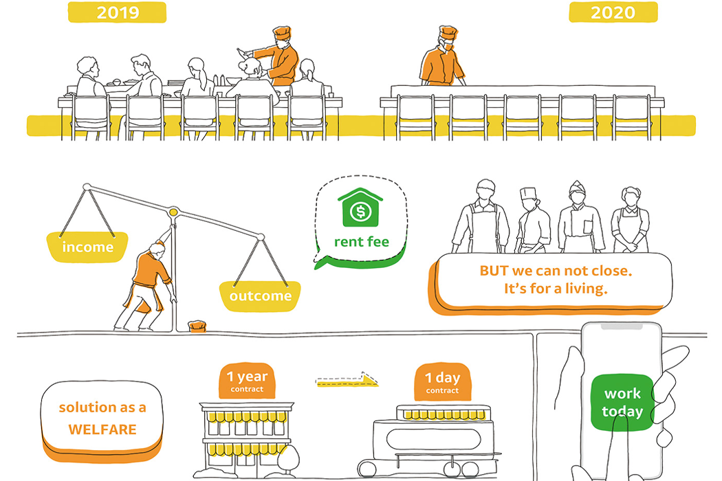 The crux of Lee’s design hinges on the pressure of restaurant owners paying rent on a monthly basis. With fewer diners, many restaurant-owners are finding themselves without the means to fund their dining spaces at the end of the month, and most are signed into year-long leases – an off-menu recipe for disaster. Lee figured that by designing a physical and transportable space for people to safely dine and for chefs to safely cook, then instead of signing into a year-long contract, food business owners could rent modular food trucks by the day and also provide safe, on-site dine-in services for guests.