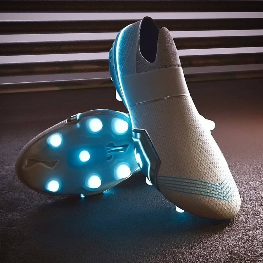 The shoes come in pristine white, with electroluminescent fabric woven into the sides and back, creating bright lines on the side, leading to a glowing, pulsating Tesla logo at the back. Moreover, the studs on the base of the shoes glow too, making them look exceptional in the dark but even more so when you’re dribbling away with the ball, creating one of the most beautiful light-streaks as you run!