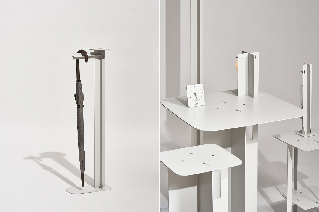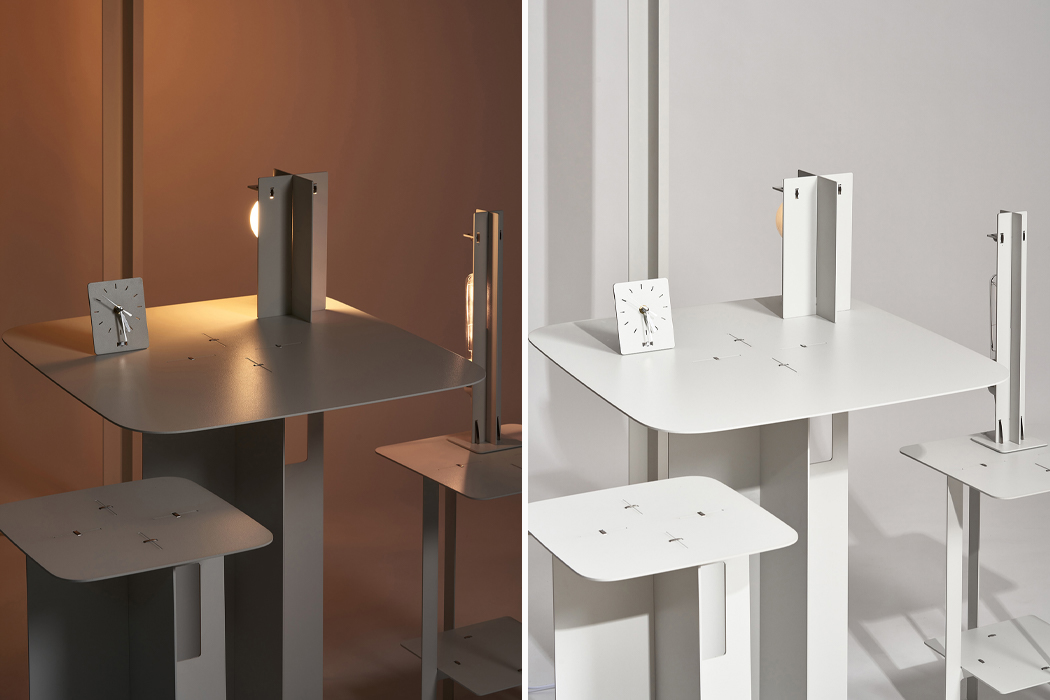 In order to construct Dawn’s Cable Furniture, the creatives at Dawn Studio essentially take the unused cable ties that bind various items together like delivery shipment boxes or bunches of cables and use them instead to fasten parts of furniture together. For example, the system’s featured side table is constructed by looping stainless steel cable ties through laser-cut slits found on the tabletop and its legs, forming a simple and sturdy table. The furniture system’s easy assembly makes it possible to build other furniture variations like umbrella holders and lighting fixtures. Following a similar construction process as the side table, the build of Dawn’s Cable Furniture’s lighting fixtures is slightly more complex. In order to fit sockets and varying bulb sizes, the metallic slabs that form each lamp’s covers are adapted to promote optimal lighting. In addition to these more fundamental furniture pieces, Dawn Cable furniture features a clock built from joined stainless steel cable ties that employ nuts and bolts to form the clock’s center dial. With Dawn’s Cable Furniture, users can create monochromatic vanity spaces or moody nighttime reading nooks.