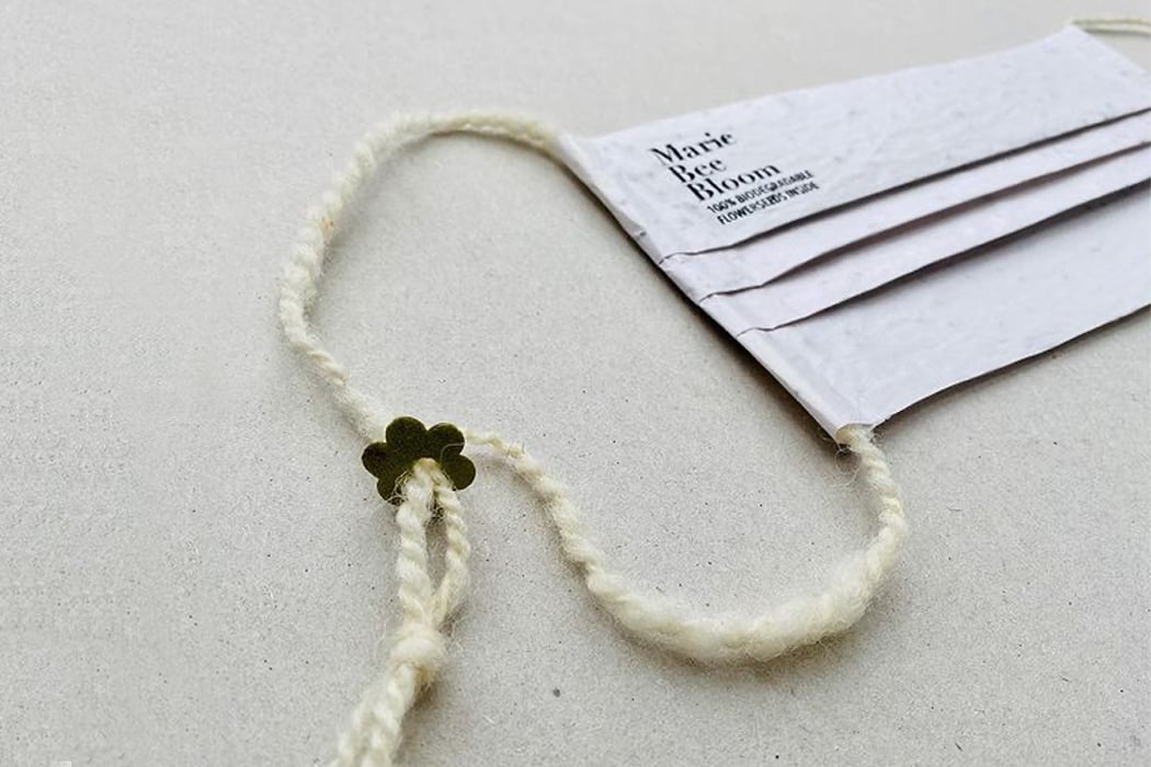 Everything about the mask is biodegradable and sustainably constructed too– from the stamped logo to the glue that holds it all together. The woolen cords on Marie Bee Bloom masks are handspun from pure sheep wool, which can be tightened or loosened around the ear with the connected adjusting piece punched out of repurposed vegetable egg cartons. The glue that holds the cord to the mask is made from potato starch. De Groot-Pons says that Marie Bee Bloom masks have not been tested for protection factors. However, they are just as safe to use as homemade fabric face masks. Besides, aren’t we all wearing two face masks nowadays anyway? Wearing a Marie Bee Bloom face mask is an easy way to help yourself, the earth, and the bees.