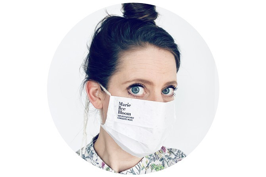 The designer Marianne de Groot-Pons wearing a Marie Bee Bloom mask.