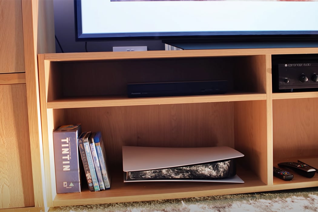 Without a flat surface, when the PS5 is laid horizontally, it doesn’t fit in entertainment consoles.