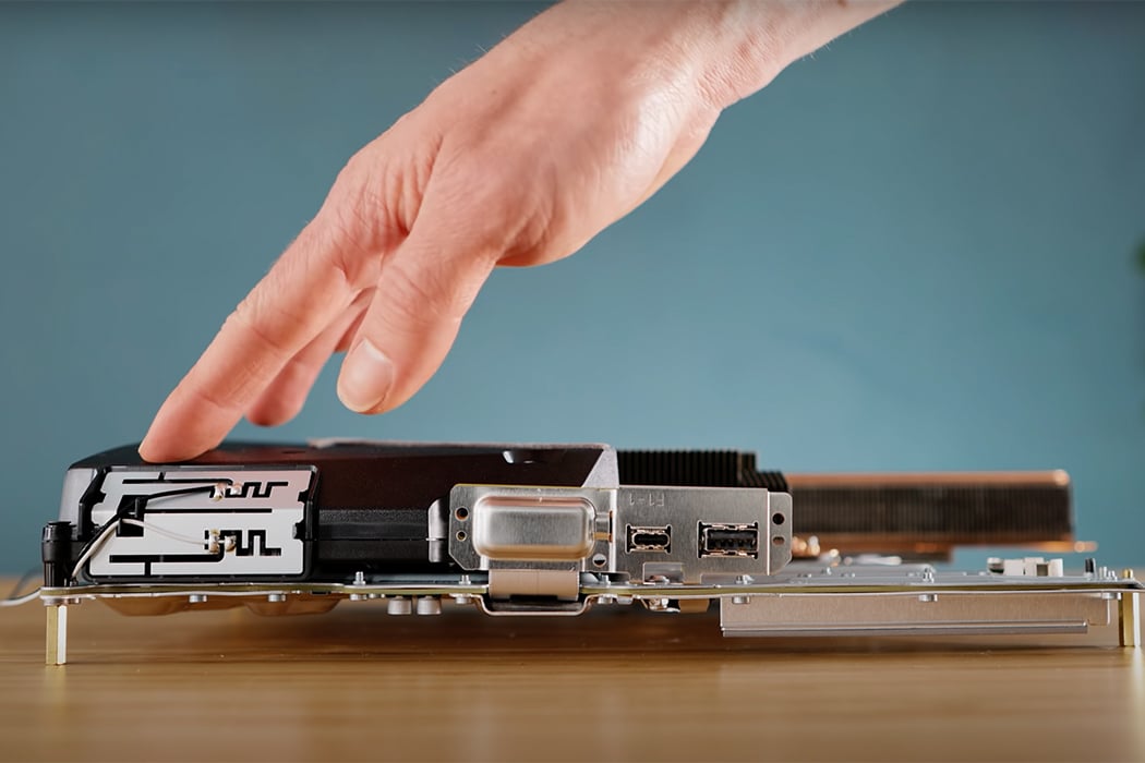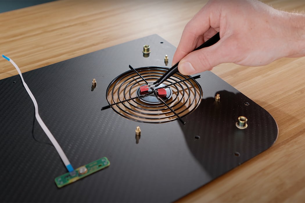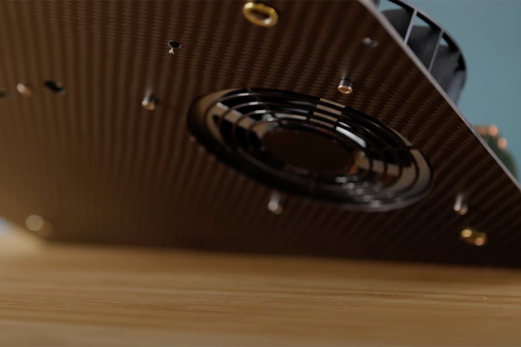 Carved into the base plate, DIY Perks creates holes where the rest of the PS5’s components fit. Next, DIY Perks mounts the system’s fan onto the carbon fiber baseplate, overlaying the fan with a grill to prevent anything from getting caught in the fan’s blades. Divided into two halves, the fan pulls air in through both sides, allowing airflow drawn from the heat sink to exit through the carved hole in the carbon fiber base plate. To direct the airflow from the heatsink to the fan, DIY Perks uses strips of foam, a cue taken from Sony.