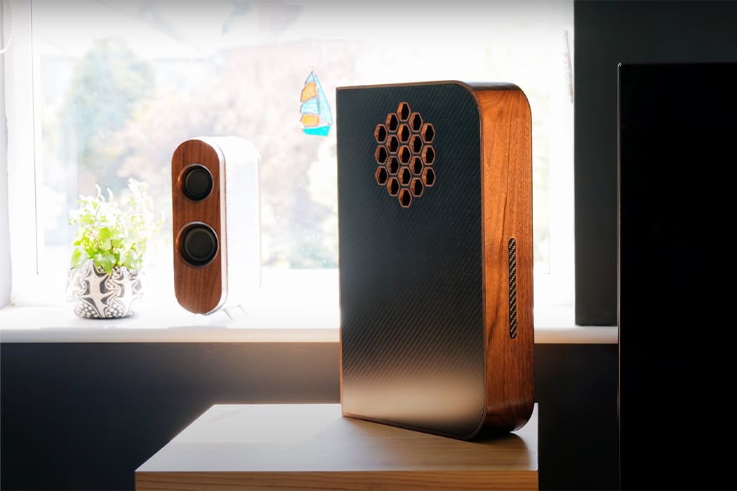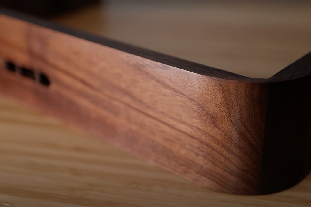 The combination of walnut hardwood framing and carbon fiber covering gives the custom PS5 case a retro feel.