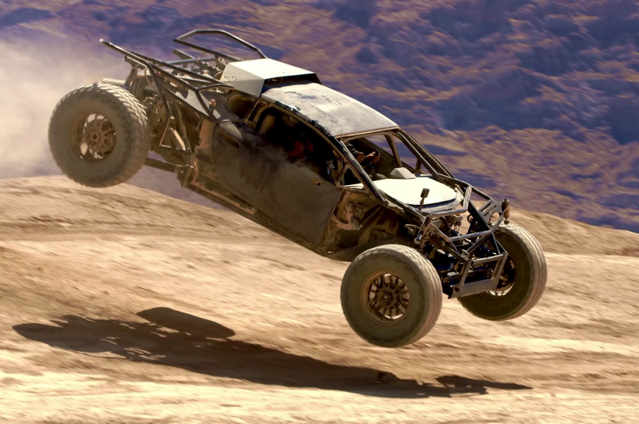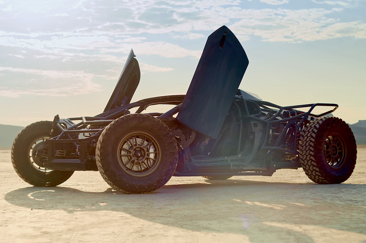 Looking like something right out of Mad Max: Fury Road, the Jumpacan features a gnarly exposed front, monster wheels, and a gravity-defying suspension system to match. Funnily enough, the doors still open vertically in the scissor style, almost as a reminder that this once used to be a luxury Italian supercar that’s now living its second life as a dune-jumping, dirt-covered monster that isn’t afraid of a few bumps in the road. The video above is a live demonstration of the Jumpacan on the Mint 400 track on the outskirts of Vegas, and behind the wheel is Chris Steinbacher from B Is For Build, taking his oddball creation for a quick spin.
