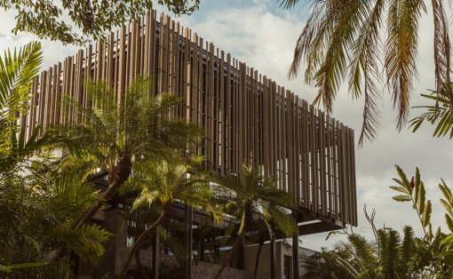 Both the interior and exterior of Sail House include natural construction materials such as woven palm, coconut shell fragments, and surfaces crafted by Javanese and Balinese artisans. “Sustainability was one of the main goals of the Sail House project. The non-corrosive and termite-resistant aluminum structural system is wrapped in reclaimed ironwood planks recycled from an abandoned pier in Borneo, as are the plank floors, decks, and the vertical louvers that control low sun and prevailing breezes,” Hertz explained. It is truly one of the most beautiful, resilient, and functional homes I’ve seen that flawlessly balances luxury with sustainability!