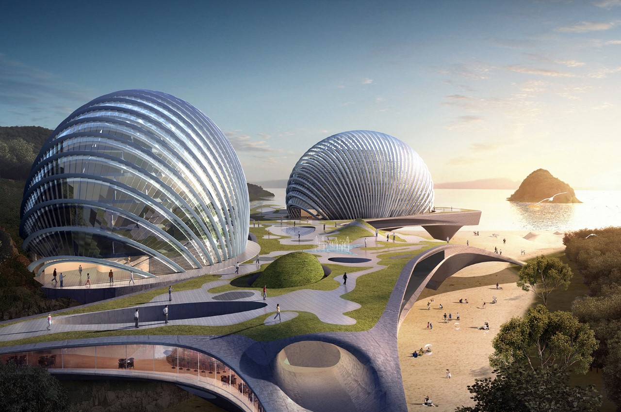 The hotel’s glass ‘shell’ forms its most recognizable element. The two shells act as the hotel’s main buildings, with coastal views for each. The rest of the hotel’s ‘body’ surrounds these two shells, forming lawns and pathways above the sandy coast of the beach, guiding you to the hotel’s several amenities, from its restaurants and bars to the spa, swimming pools, and finally back to your room at the hotel. The animal-inspired building comes with signature tentacles too, that sort of form the entrances and exit roads, cutting through the wilderness to let you arrive at or check out of your destination.