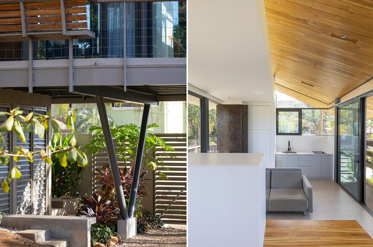 The home is set atop V-shaped stilts, reducing its impact on the land while also creating a covered outdoor space below. But raising it was also a way to plan for the changing climate: “Elevating the structure addresses the fact that our sea level is actually rising and properties will have to deal with this in the future,” explains Tinoco.
