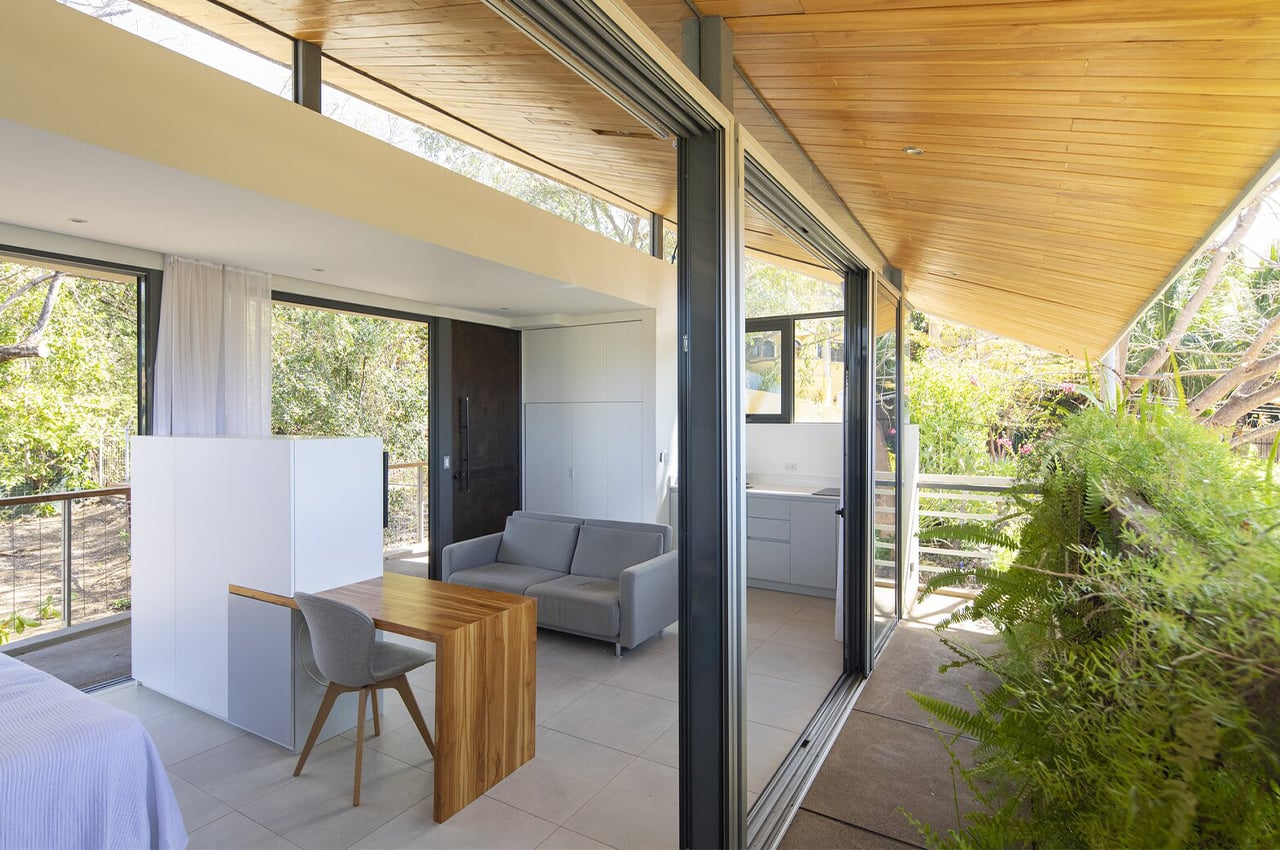 Casa Jardin’s interiors feature a neutral color palette that helps keep an emphasis on the natural environment outside. A teak wood ceiling, light gray porcelain tile, and whitewashed walls combine to create a naturally illuminated space. It is also inspired from a beachy aesthetic and visually keeps the space light, refreshing, and open!