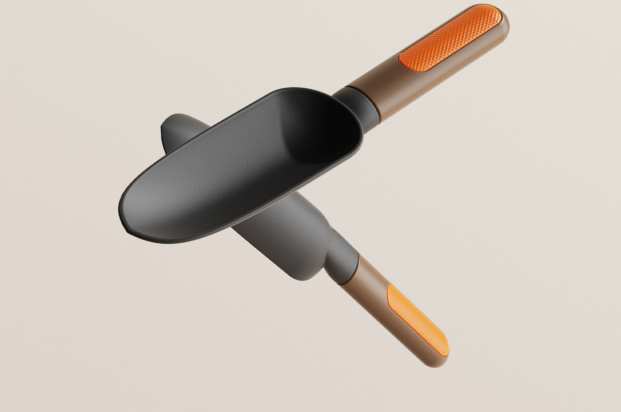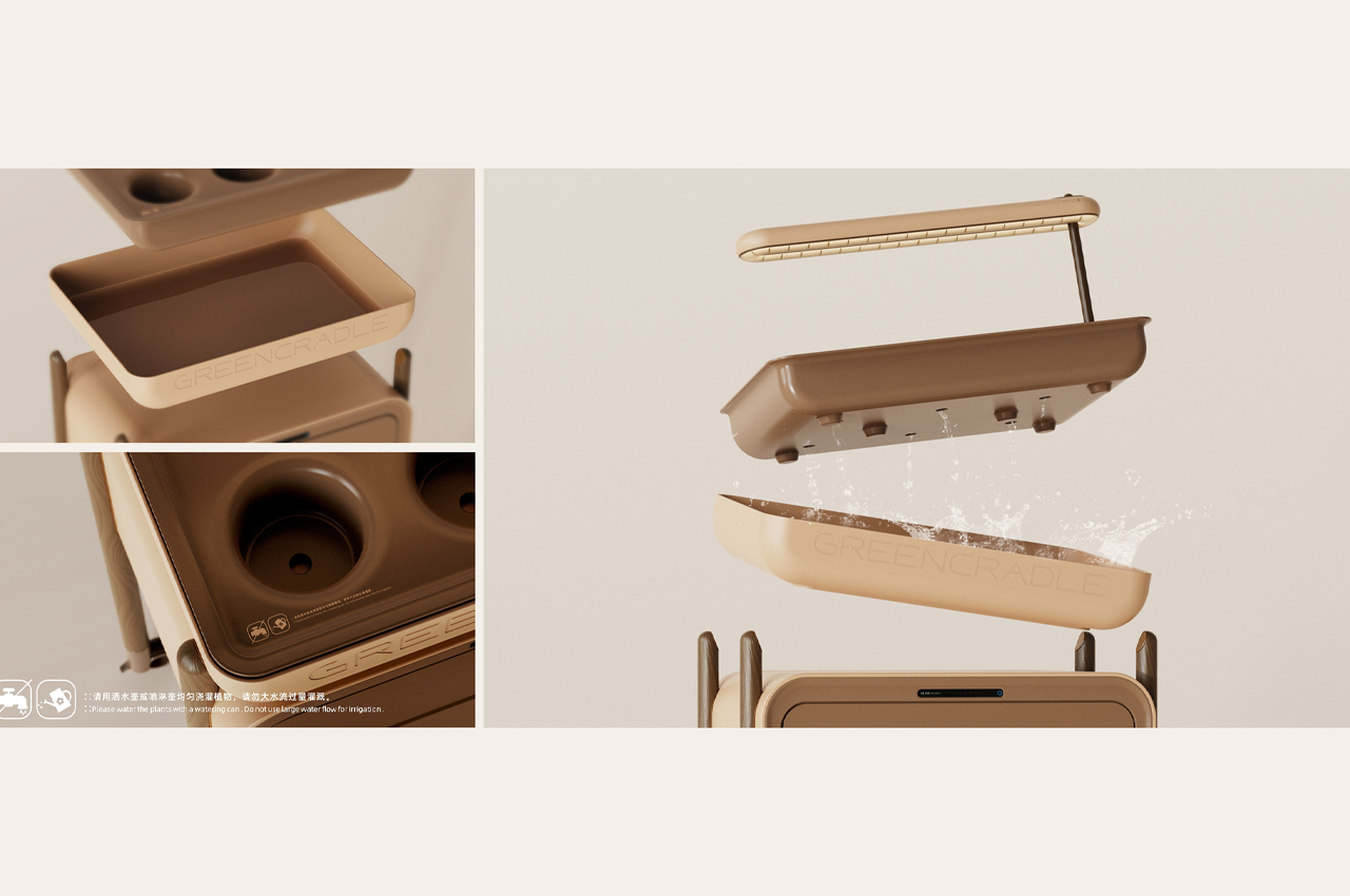 The deep fertilizing bin stands just to the left of an embedded case for a shovel. There, users can deposit their kitchen waste over the soil before adding fertilizing bacteria to start the process.