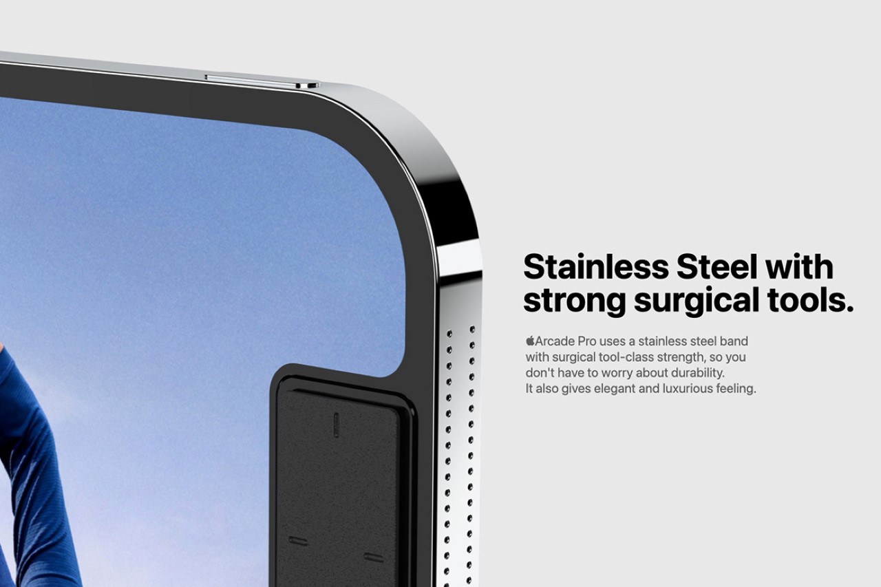 The Apple Arcade Pro models itself on the successful iPhone format. It comes with a Stainless Steel body in four different finishes, and sports the same flat-edge design as the iPhone. On the front, however, things are a bit different. There’s no front-facing camera, but the notch is still there. In fact, there are two notches on either side of the device, allowing for the Arcade Pro to have its controls – an ambidextrous set of D-pads that change function depending on what game you’re playing. On the rim, the volume buttons are replaced by left and right shoulder buttons, and the speaker modules now go all the way from one corner to the other, immersing you in audio as you game.