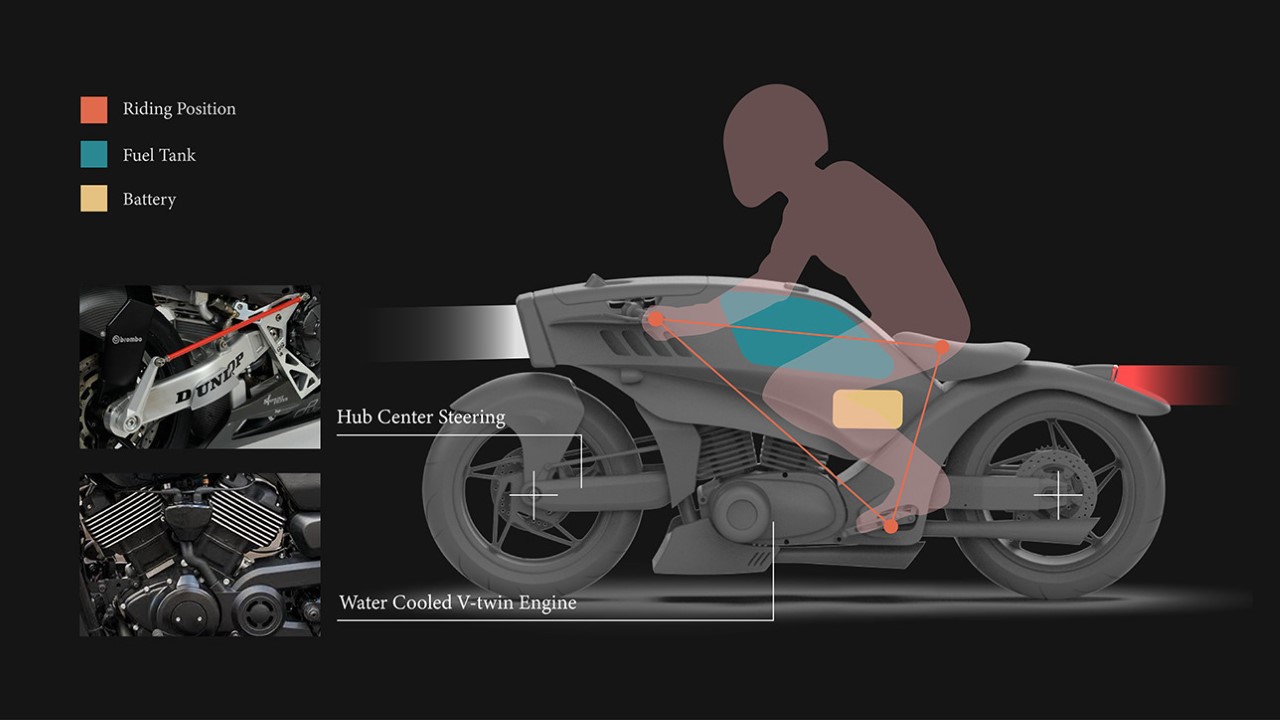 The Harley-Davidson concept takes on a hybrid engine approach, making it potentially the first hybrid Harley. It comes with your traditional fuel tank, but also sports a battery right under it. Although this is just a concept, the thought of having a flammable battery right below the fuel tank does quite bother me. In fact, it’s probably the only thing I’d immediately change about this motorbike.
