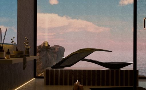 Designed by Reza Mohtashami, this bedroom at Skypoint Villa features an all-black aesthetics with dark wooden flooring to complement it. The open room is surrounded by floor-to-ceiling windows, and a skylight instead of a typical ceiling, giving you beautiful views all over. It’s the perfect master bedroom to relax and unwind in.