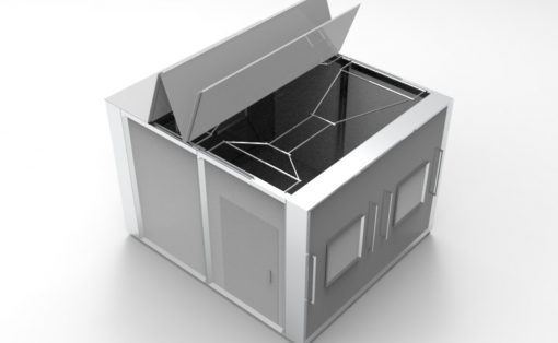 It features a gabled roof that is crafted from sheets of pitched aluminum. The roof extends and takes on a projected form, creating a covered terrace. A triangular partition separates the terrace from the interiors of the home. Most of the facade is clad in Portuguese expanded cork – which is placed in vertical strips across the structure. The strips are of varying widths, and the designers say this is the first time cork has been used in this manner in the Czech Republic.