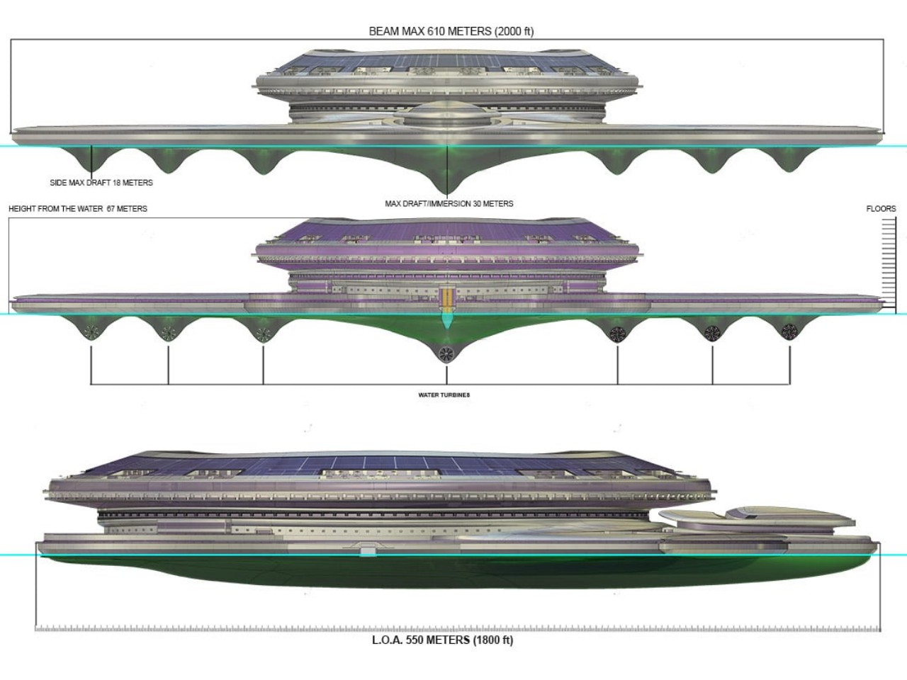 If a luxury cruise ship can be called a floating hotel, Pangeos is pretty much a floating resort city. It will contain everything that humans will need to live in comfort for weeks or even months, including hotels, shopping centers, parks, and other facilities. And since it wouldn’t be safe to actually take a dip in the surrounding ocean, it also has extra-long swimming pools on the turtle’s “wings.” The floating city will have a marina and even its own airport to get guests on and off. All in all, it is planned to accommodate up to 60,000 guests, which doesn’t yet count the thousands of crew needed to man this giant turtle.