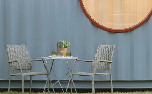 The back of the house features a covered space that enables the residents to lounge about in the outdoors while being protected from harsh sunlight. A double-height area equipped with a staircase is located next to the garage. This area boasts monolithic wooden treads cemented into the concrete wall.