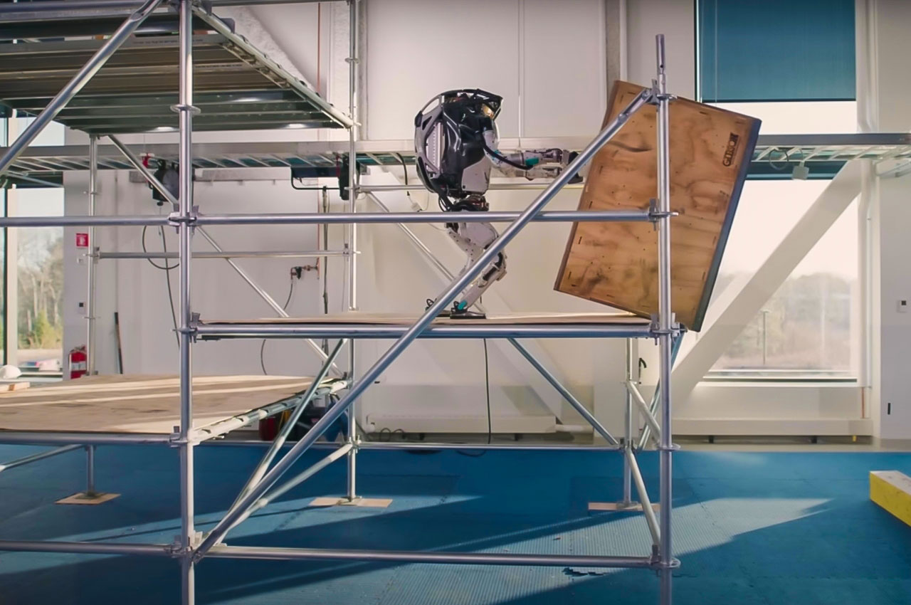 The “hands” of the Atlas robot are actually made up of one fixed finger and a moving finger that are more like a gripper. The video shows the robot throwing a bag of tools to its owner but the lead up to that final action is pretty impressive. It’s able to pick up a plank of wood to help it go up to the scaffolding where he eventually throws up the forgotten bag. And of course, just to show off, it does a few more parkour moves after delivering the package.