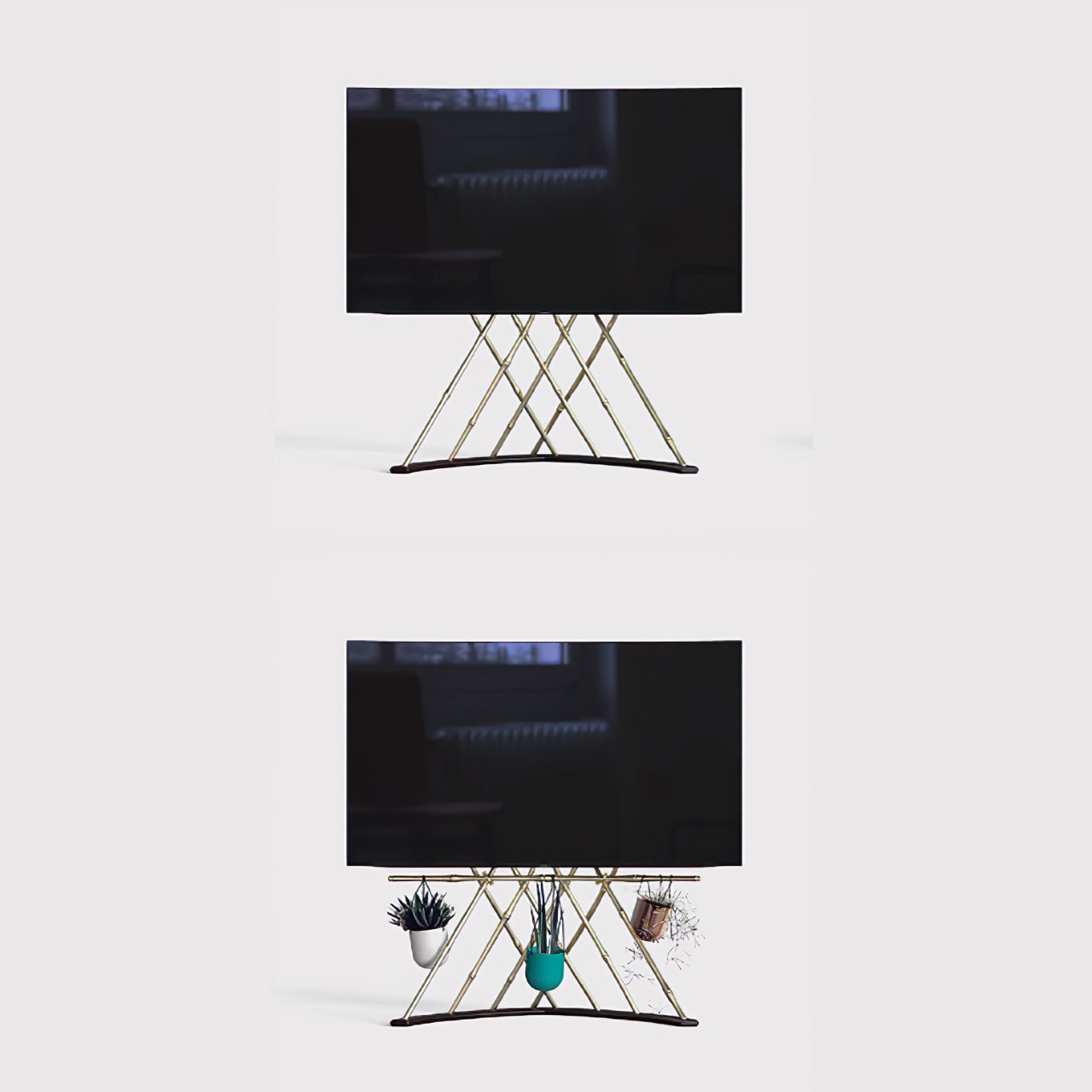 Assaraf’s stand looks nothing quite like any TV stand you’ve seen, in that it takes its plant-based inspiration extremely seriously. The stand looks like it’s made from curved pieces of bamboo shoot or wicker, although it’s actually molded steel. This different approach allows the stand to borrow the physical properties of steel (its strength) without necessarily opting for a design that feels commonplace. The Jungalow-inspired stand adds a natural touch to the otherwise man-made character of the television, and looks even more appealing from the back than it does from the front!