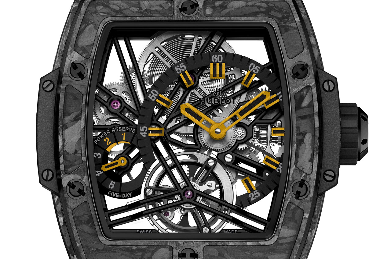 The Spirit of Big Bang Tourbillon is powered by the impressive self-winding HUB6020 Power Reserve Skeleton Tourbillon Movement. This movement offers a remarkable 5-day power reserve, while the intricate tourbillon mechanism showcases Hublot’s commitment to pushing the boundaries of watchmaking.