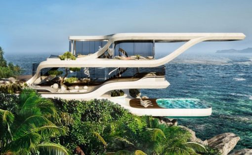 The organic form of the home is really quite interesting. It houses two storeys, with the glazed lower storey amped with timber slots that provide shading. The upper storey features fluid white rendered walls that bring to mind the image of petals. “The flower petals embrace the entire upper floor,” studio founder Sandra Casinha. “To reinforce their presence, we limit the use to three materials: white [concrete], which draws the petals, aluminum, and glass. Thus, the petals gain more expression.”