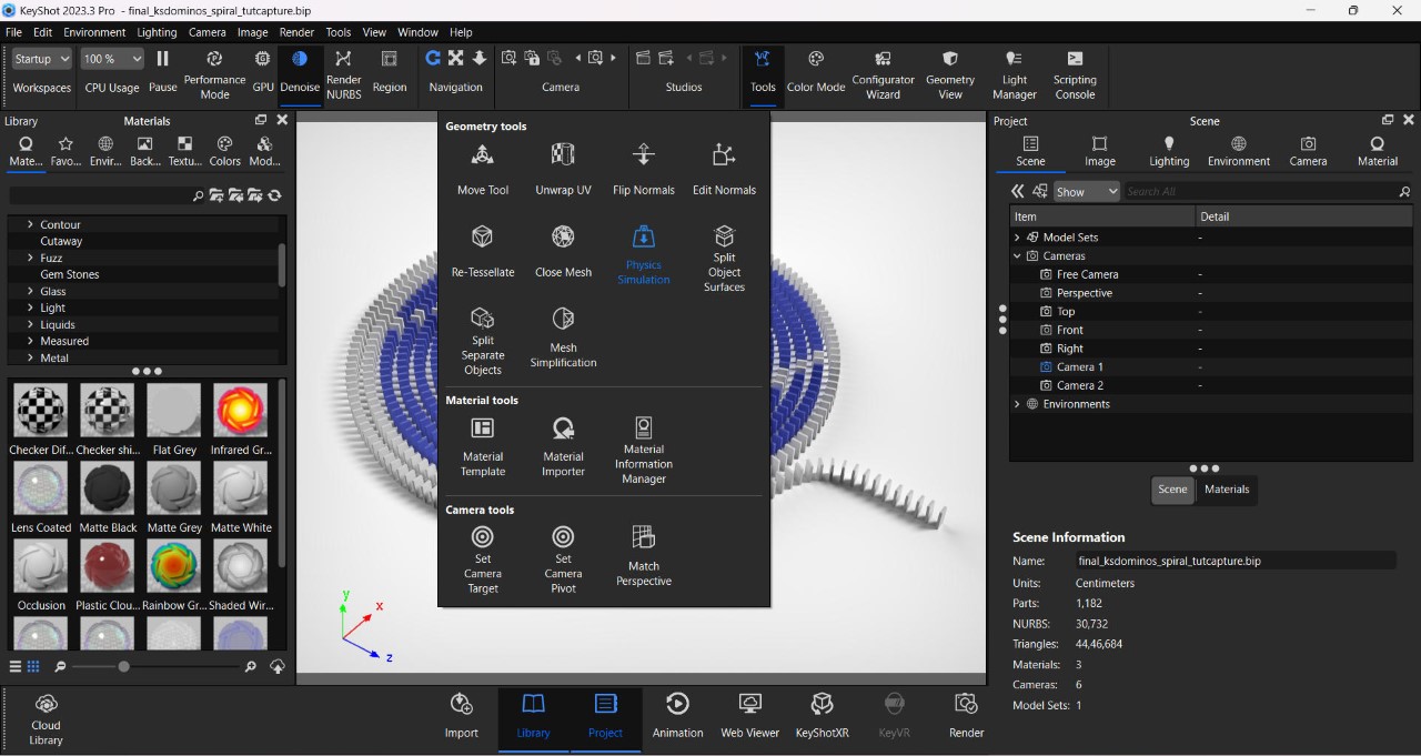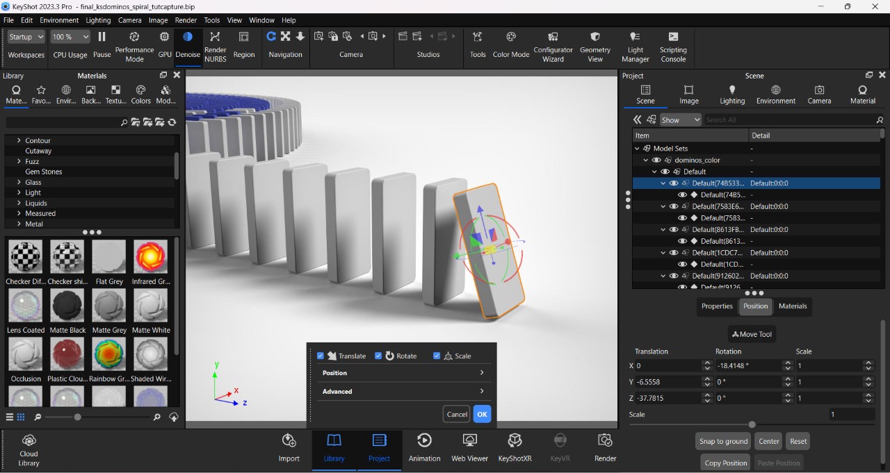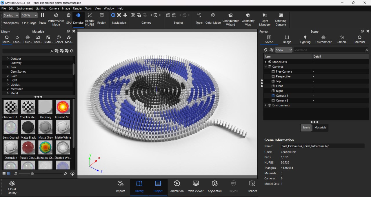 The simulation then becomes a part of KeyShot’s Animation timeline, and you can then play around with camera angles and movements to capture your entire scene just the way you visualized it. I created multiple clips of my incredibly long domino chain reaction (in small manageable chunks because my laptop crashed at least 8 times during this) and stitched them together in a video editing app.