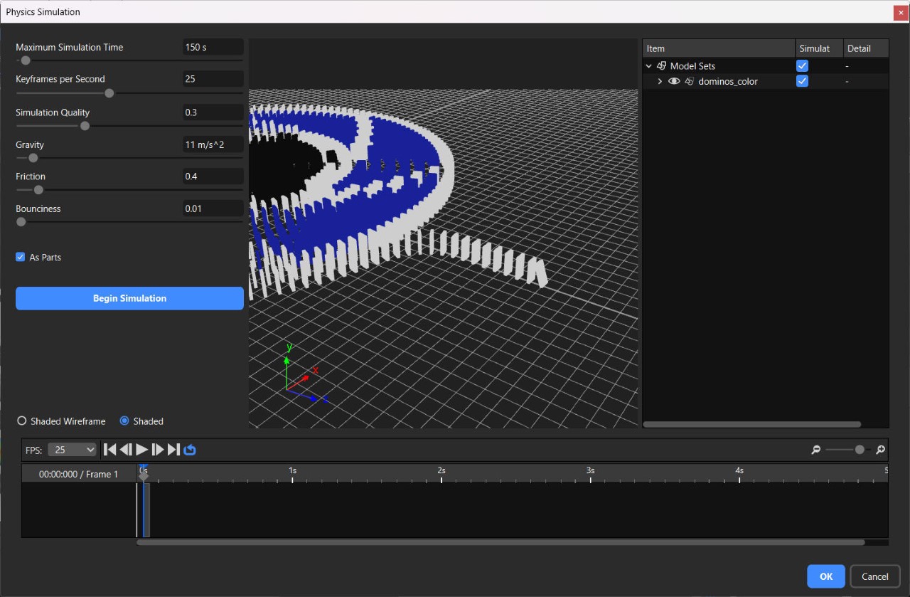 The settings on the left are rather basic but extremely powerful. You start by first setting the maximum simulation time (short animations require short simulations; considering mine was a long chain reaction, I chose 200 seconds), followed by Keyframes Per Second – This basically tells KeyShot to make your animation more detailed or choppy (think FPS, but for simulation). I prefer selecting 25 keyframes per second since I’m rendering my animation at 25fps (just to keep the simulation light), but you can bump things up to 60 keyframes per second, which gives your simulation smoother detail. You can then bump up your animation FPS to render high frame-rate videos that can then be slowed down for dramatic slow motion. Simulation quality dictates how well KeyShot factors the physics in – it’s at a default of 0.1, although if you feel like your simulation looks off, bump it up to a higher value.