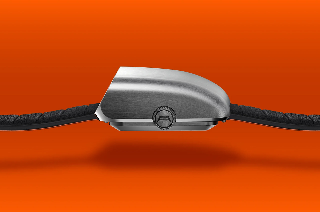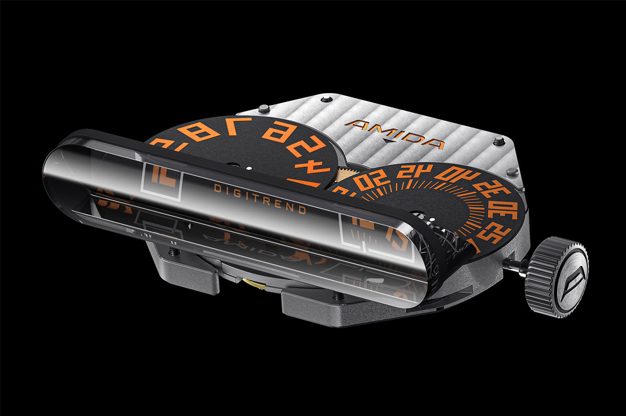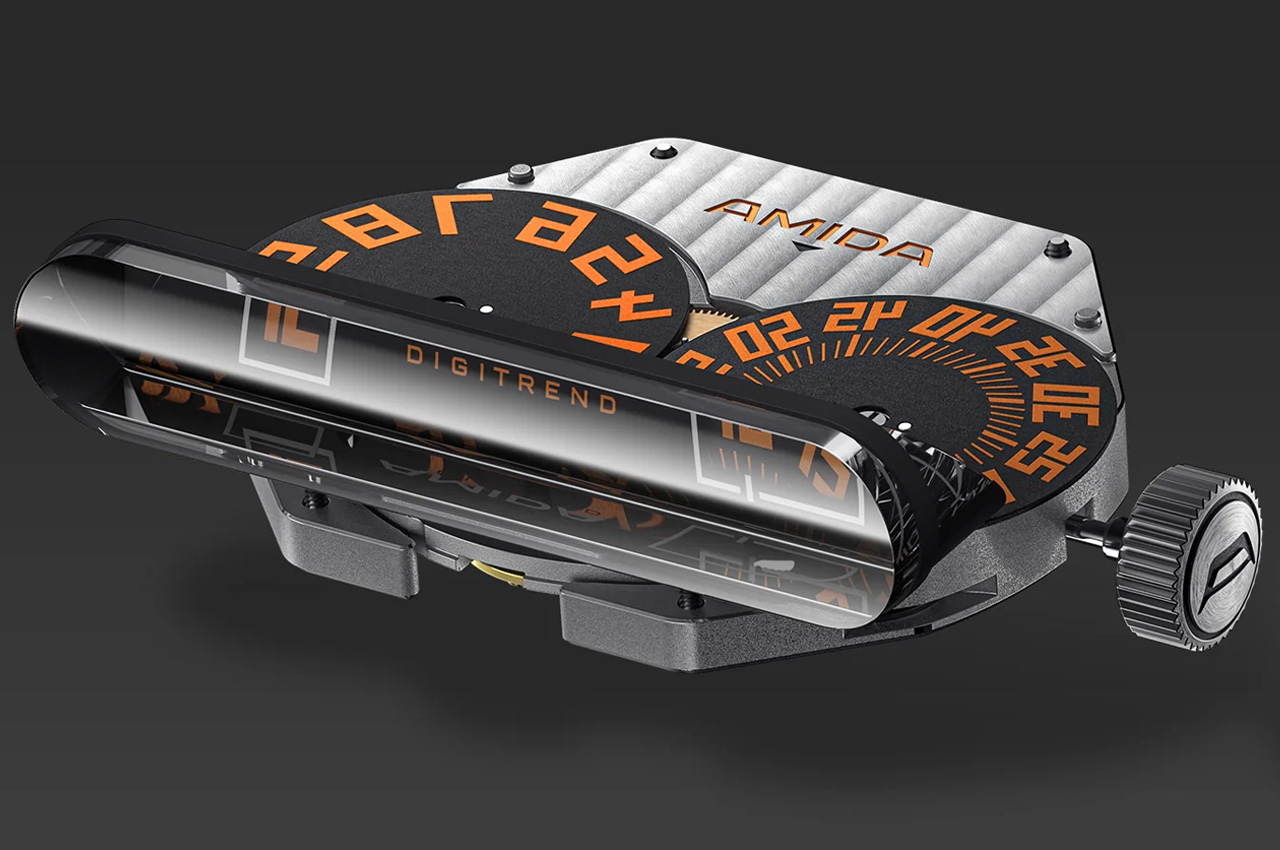 The steel casing is overly opaque revealing nothing more than the dashboard-style time display and a winding crown on the side. On the left side of the display are the jumping hours and the trailing minutes are visible in the right corner, with Amida Digitrend typography taking up the center space. The caseback is visually interesting with a serial number for the Take Off Edition, a rocket art, and a see-through window showing the new movement in its entirety. The new Amida Digitrend watch, is set to be available for preorder starting May 28 (delivery to begin in October). It comes paired with either a charcoal Alcantara strap or an orange-colored calfskin strap with a stainless steel buckle.