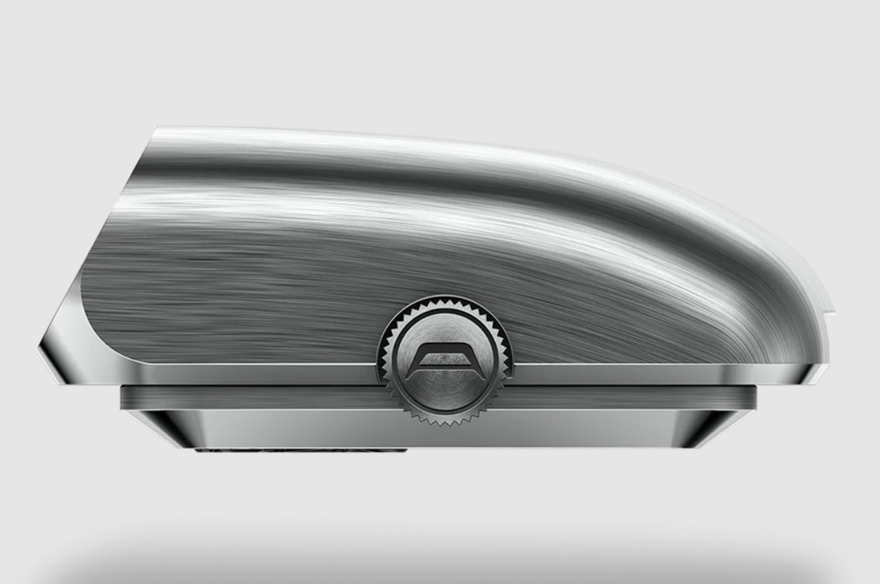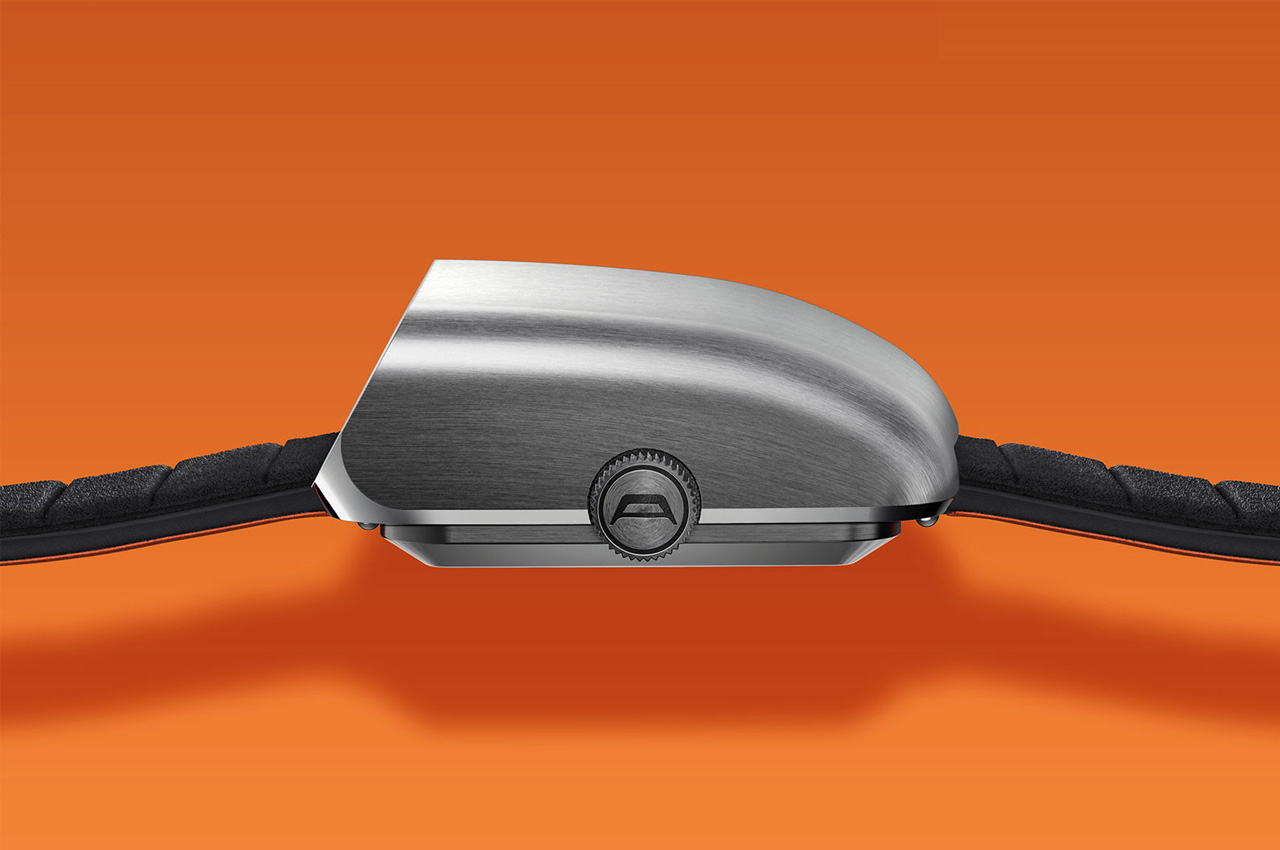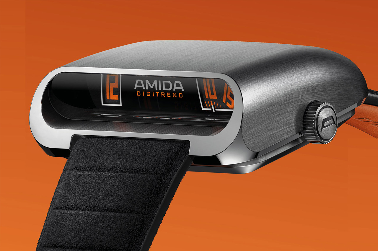 For this, the watch has the usual horizontal, dual hour and minute discs, which using the sapphire crystal prism for the display show them vertically; the prism even helps magnify the vertically presented digital numerals for better legibility. This atypical display of the Amida Digitrend is a result of its unusual case shape inspired by classic sports cars and modern architecture. To that accord, the car-body-like case of the Digitrend is made from a block of 316 L stainless steel. It is sleeker – measuring 39mm across – than the original yet maintains a retro-futuristic vibe to it.