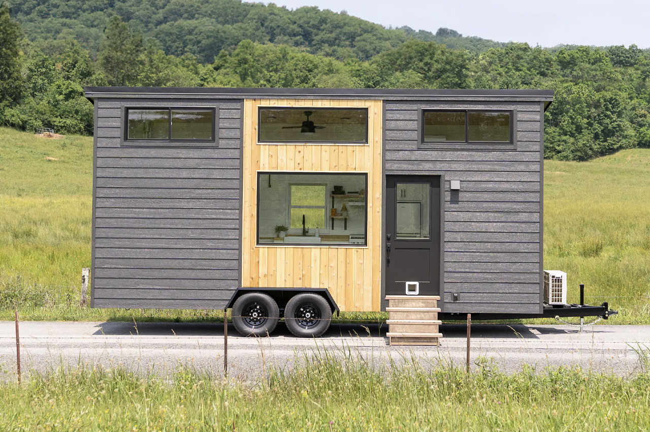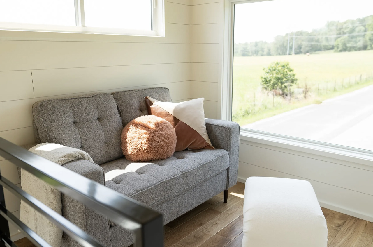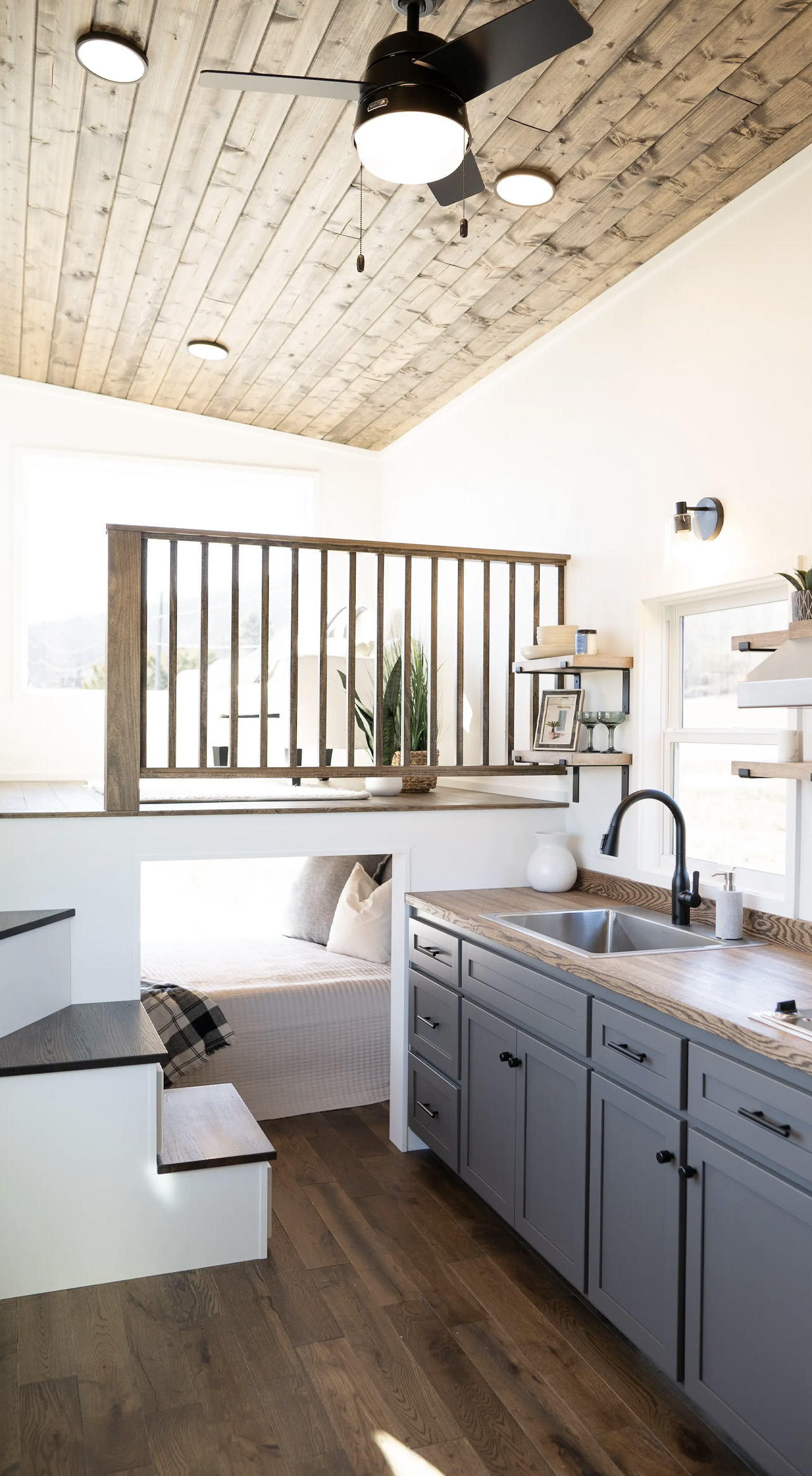 The living room is placed right above the bedroom, and you can reach it via a storage-integrated staircase. The living room contains a sofa, coffee table, and TV, as well as a large window that offers pretty views for people to look at. The ground floor also includes a kitchen beside the bedroom. The kitchen is placed in the center of the house, and it contains a sink, an electric cooktop, a fridge/freezer, custom cabinetry as well as space for a washer/dryer. You can also add an oven if need be. The kitchen also has a mini-split air-condiitoning unit for cooling and heating.