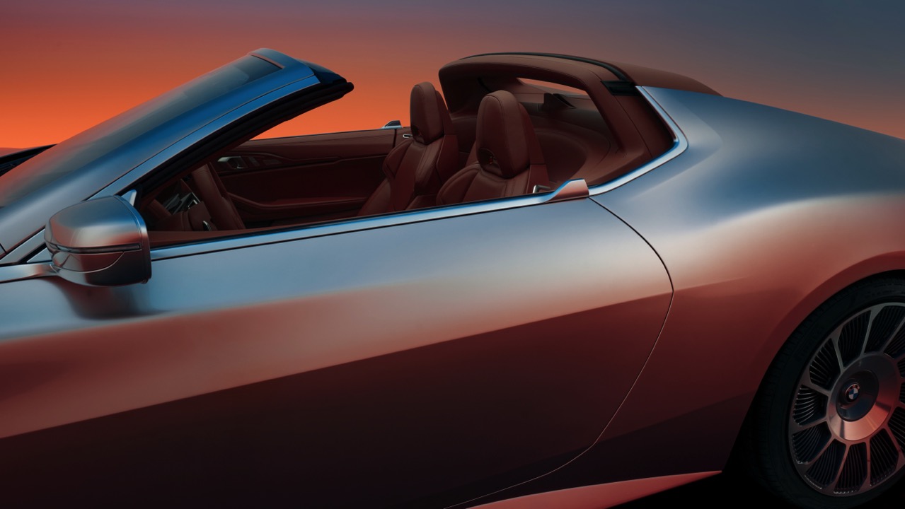 The roof of the BMW Concept Skytop is a crucial element in its design, both when on and off. When the roof is on, it maintains the car’s sleek silhouette, with the reddish-brown tone flowing into the muted silver of the body. This color gradient, crafted by BMW’s master painters, ensures a smooth transition that enhances the vehicle’s visual appeal. The roof’s design also includes a central spine that aligns with the hood’s spine, maintaining the design’s continuity from front to back.