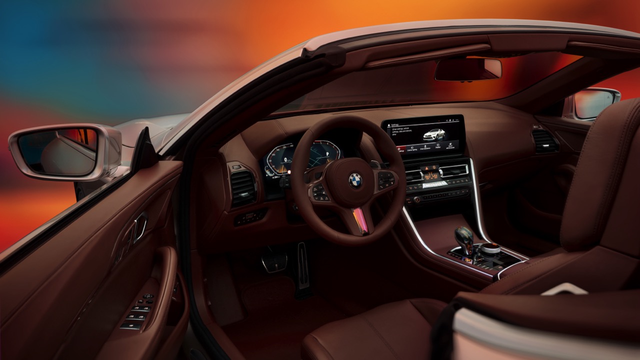 The dashboard exemplifies modern automotive design, featuring crystal applications seamlessly embedded into the cockpit. These elements enhance the overall aesthetic appeal and showcase BMW’s craftsmanship in blending contemporary design elements. The center console, with its sleek design and intuitive layout, ensures all controls are easily accessible to the driver, further enhancing the driving experience. The steering wheel, wrapped in the same reddish-brown leather as the seats, features a modern design that integrates seamlessly with the rest of the interior. The digital display behind the wheel provides the driver with all necessary information clearly and concisely, ensuring that the focus remains on the road.