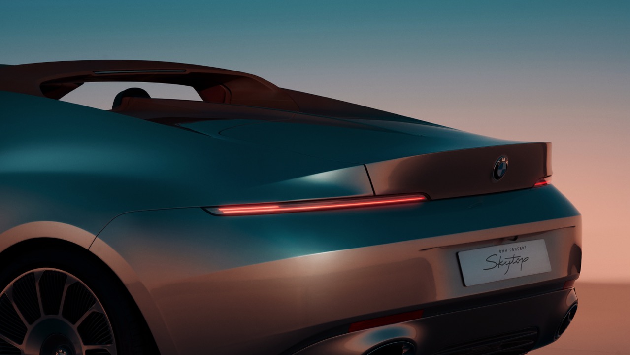 The rear of the BMW Concept Skytop continues the theme of sculpted elegance, blending form and function to define the car’s overall aesthetic. Clean, sculpted lines emphasize the car’s wide and stable stance. The slim, horizontal rear lights extend across the vehicle’s width, creating a visual connection that enhances the perception of width and stability. These lights seamlessly integrate with the bodywork, maintaining the clean, uninterrupted lines that define the car’s design.
