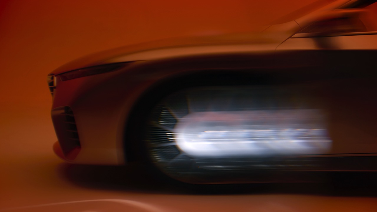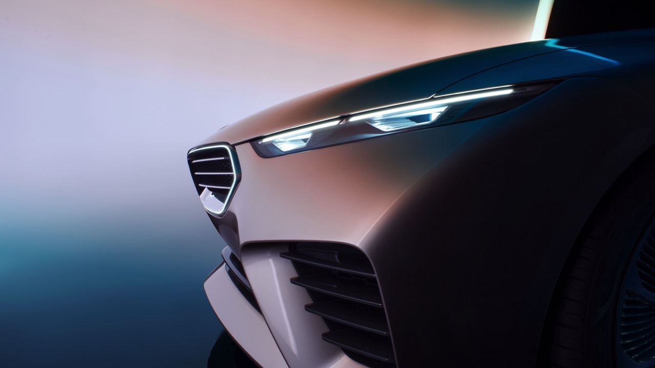 The BMW Concept Skytop’s front design is dominated by the signature shark-nose grille, illuminated to emphasize the vehicle’s sleek and aggressive stance. This design choice reflects BMW’s rich heritage while seamlessly integrating with the contemporary LED headlights on milled aluminum carriers. The headlights’ slim profile contributes to the car’s aerodynamic efficiency and modern aesthetic.